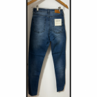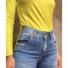 Calça Cigarrete, lavagem média, barra normal. Tem elastano.