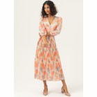 Vestido midi confeccionado em chiffon. Estampa aquarelada de gatos e pompons. Decote V. Mangas 7/8 com franzido nos ombros e elástico nos punhos. Cintura marcada com elasticidade e aplicação lateral de pin dourado no formato do nosso amado Passarix. Saia com micro plissado que suaviza ao longo do comprimento. Fechamento traseiro por zíper invisível. É forrado.